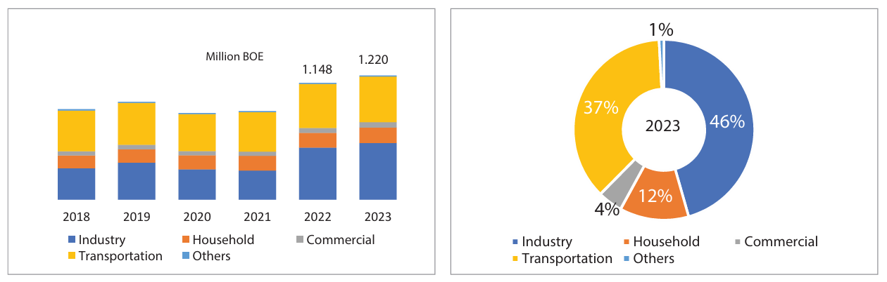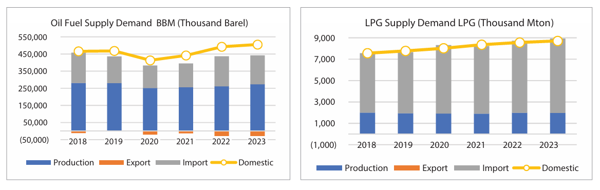 Untuk produk hilir, impor BBM dilaporkan 26,8 juta kiloliter, dengan penjualan domestik 80,4 juta kiloliter. Pada komoditas rumah tangga, impor LPG mencapai 6,9 juta ton, ketika penjualan domestik sekitar 8,7 juta ton. Hal ini membuktikan sebagian besar kebutuhan masih ditopang pasokan luar negeri.
